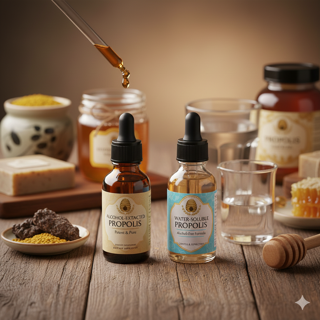| 구분 | 알콜추출 프로폴리스 | 무알콜(수용성) 프로폴리스 |